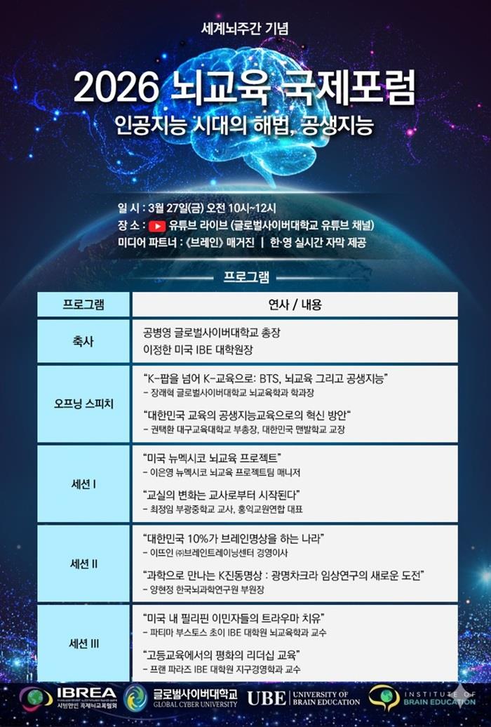 포럼은 공병영 글로벌사이버대학교 총장과 이정한 미국 IBE 대학원장의 축사로 문을 연다. 이어지는 오프닝 스피치에서는 장래혁 글로벌사이버대학교 뇌교육학과 학과장이 ‘K-팝을 넘어 K-교육으로: BTS, 뇌교육 그리고 공생지능’ 주제로 발표하며, 맨발학교 교장으로 유명한 권택환 대구교육대학교 부총장이 ‘대한민국 교육의 공생지능교육으로의 혁신 방안’을 제시한다.